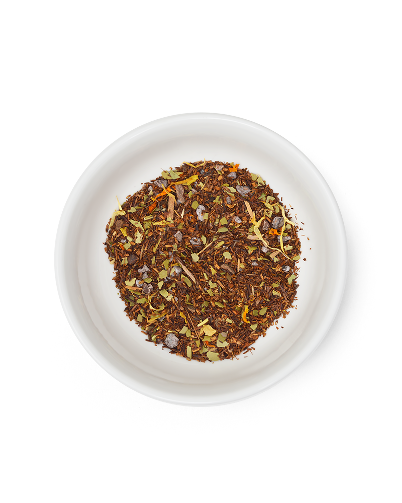 Rooibos, Green Yerba Maté, Catuaba Bark, Cacao Nibs, Calendula Petals