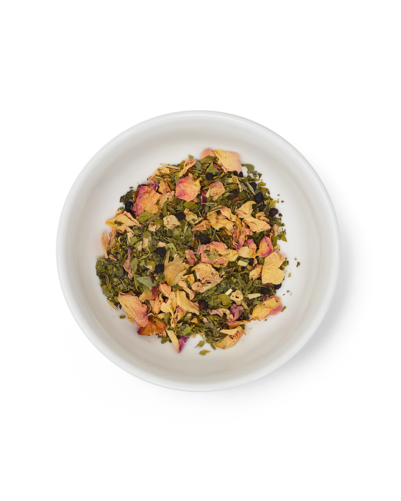 This soothing blend combines the light sweetness of elderberries and rose petals with calming herbs like lemon balm, oatstraw, and skullcap, all known for their natural stress-relieving benefits.