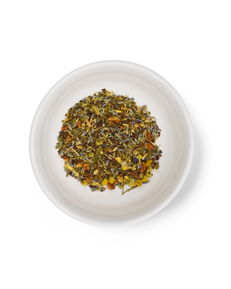 Apple Pieces, Lavender, Chamomile, St. John's Wort, Lemon Balm, Licorice, Fennel, Peppermint, Valerian Root.
